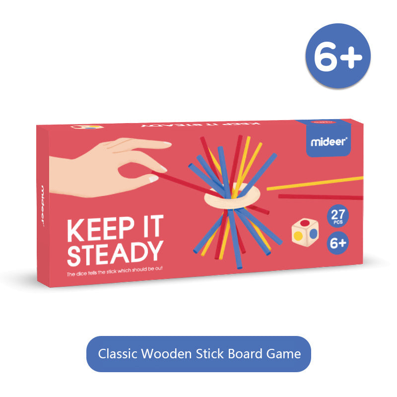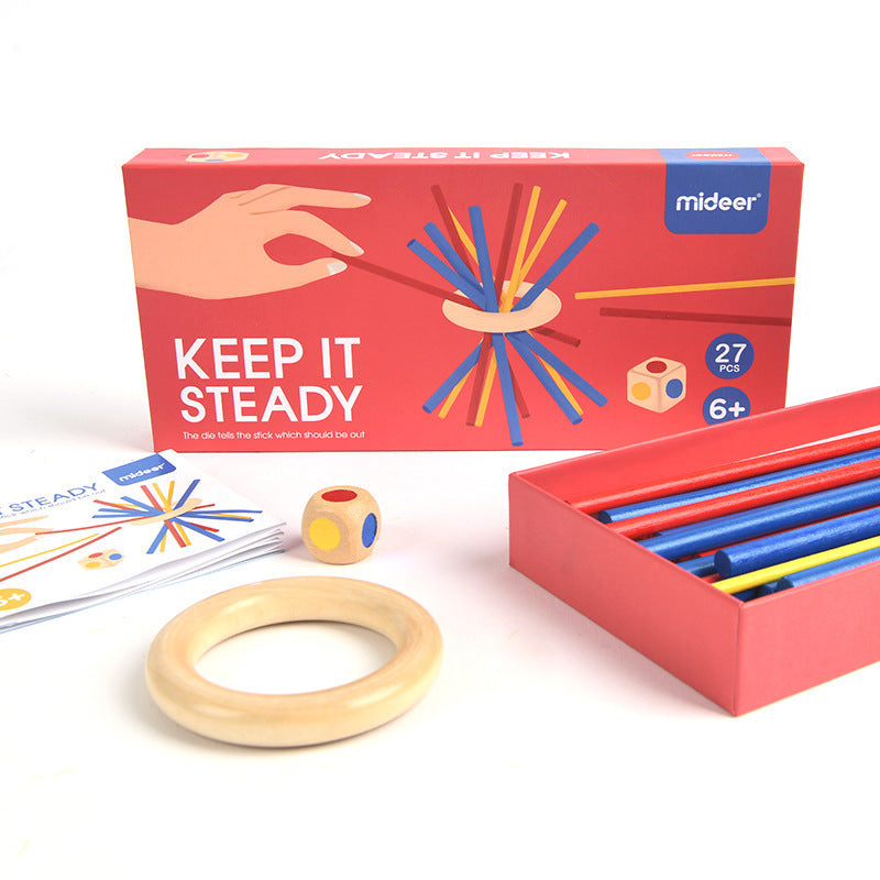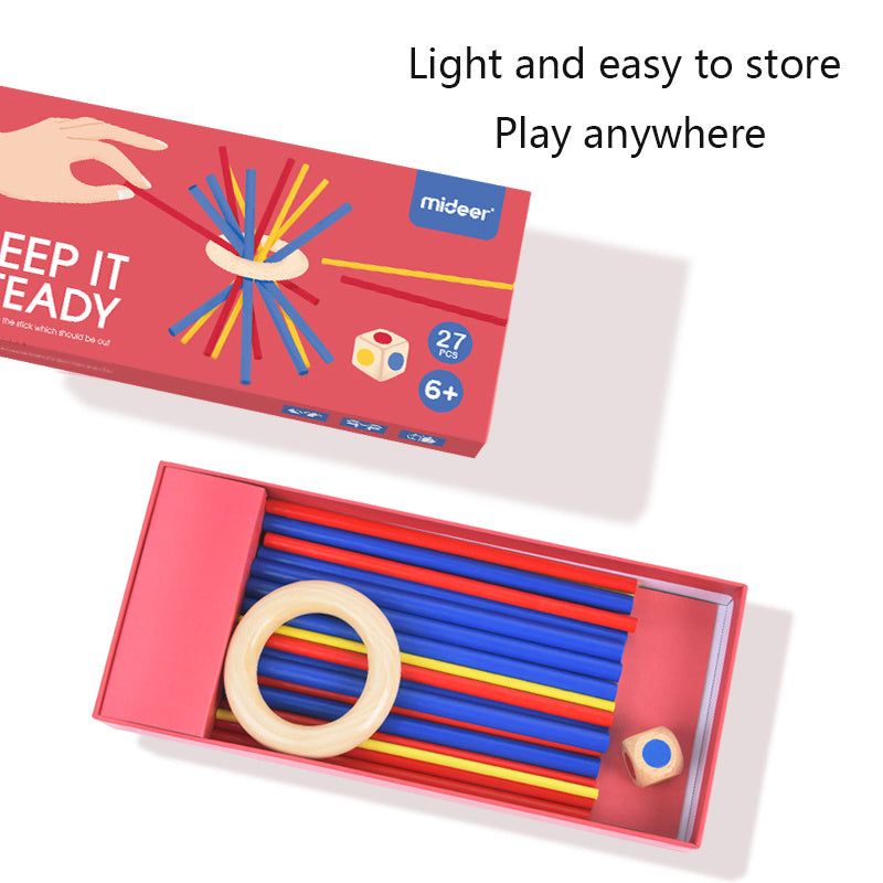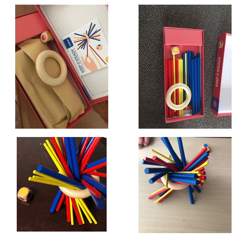 Ett lekfullt bordsspel där barn staplar färgade träpinnar på en grisfigur utan att låta dem ramla. Perfekt för både individuell lek och spel tillsammans.